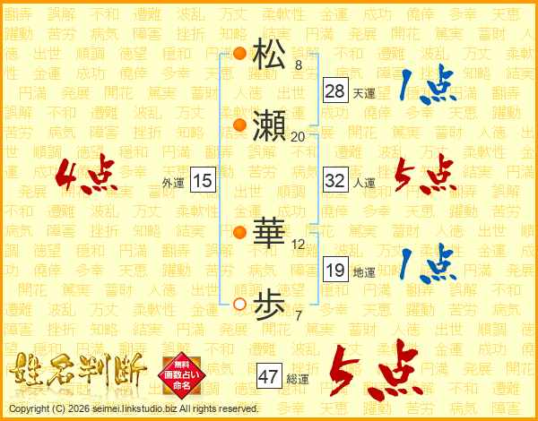 松(8画)瀬(20画) 華(12画)歩(7画)