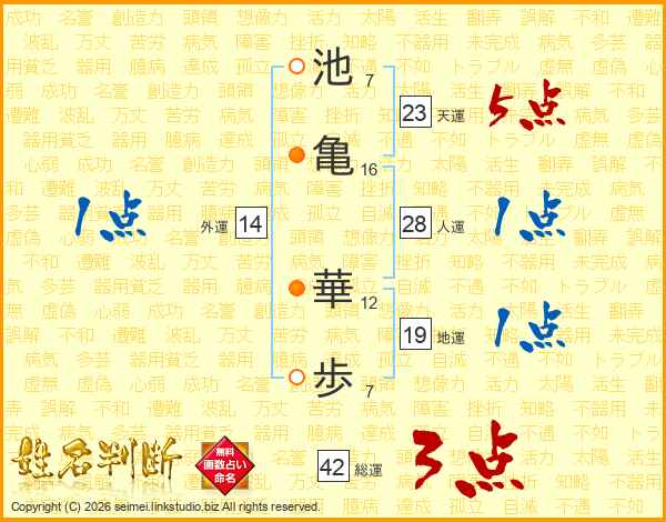 生活面を象徴する運勢です。外部から受ける影響力を表し、結婚運、家庭運や職場、環境への順応性を表します。総運から人運を引いた画数。姓や名が1文字の場合を除く。