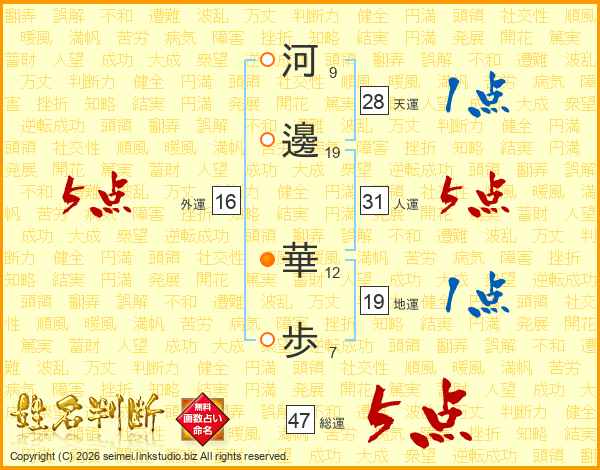 生活面を象徴する運勢です。外部から受ける影響力を表し、結婚運、家庭運や職場、環境への順応性を表します。総運から人運を引いた画数。姓や名が1文字の場合を除く。