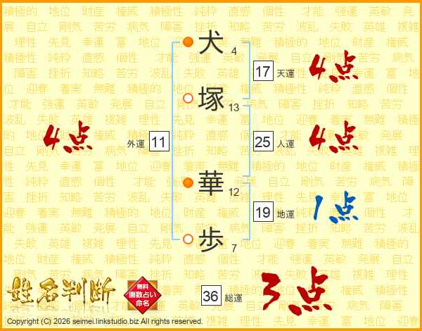 犬(4画)塚(13画) 華(12画)歩(7画)