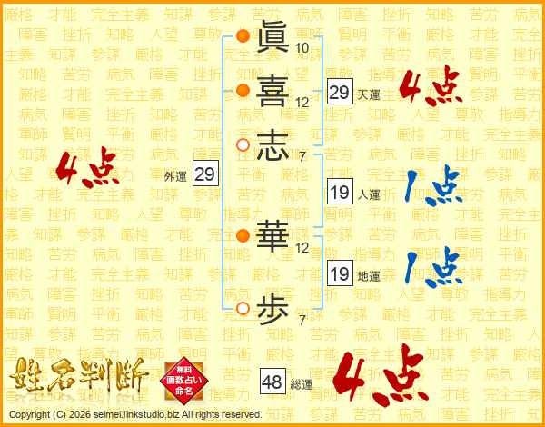 眞(10画)喜(12画)志(7画) 華(12画)歩(7画)
