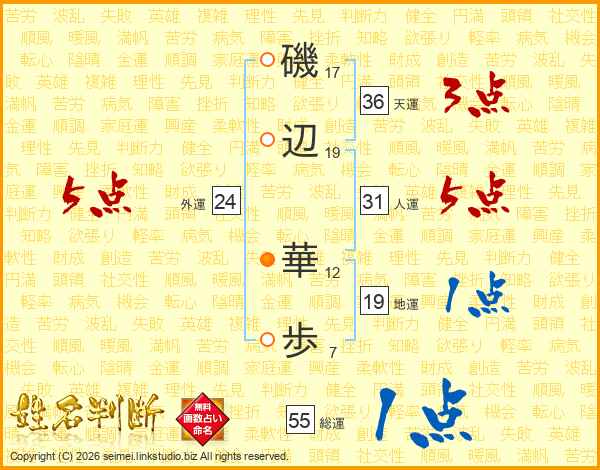 磯(17画)辺(19画) 華(12画)歩(7画)