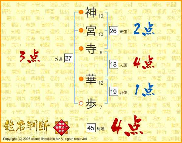 神(10画)宮(10画)寺(6画) 華(12画)歩(7画)