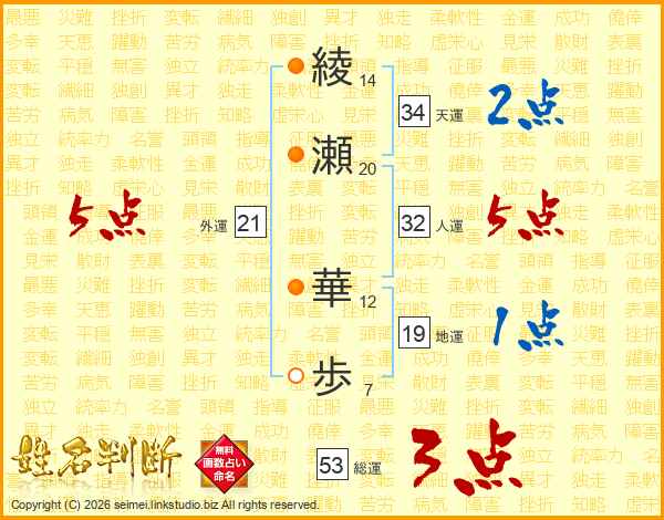 綾瀬華歩さんの総運は53画の3点!