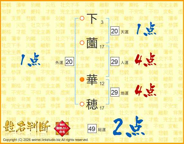 生活面を象徴する運勢です。外部から受ける影響力を表し、結婚運、家庭運や職場、環境への順応性を表します。総運から人運を引いた画数。姓や名が1文字の場合を除く。