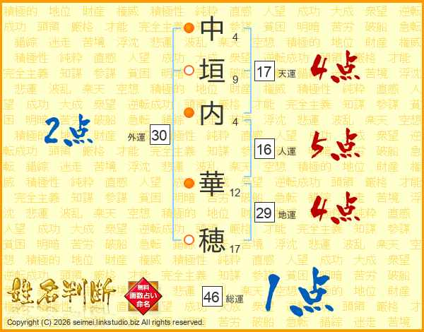 中(4画)垣(9画)内(4画) 華(12画)穂(17画)