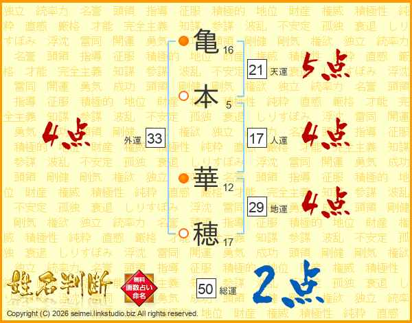生活面を象徴する運勢です。外部から受ける影響力を表し、結婚運、家庭運や職場、環境への順応性を表します。総運から人運を引いた画数。姓や名が1文字の場合を除く。