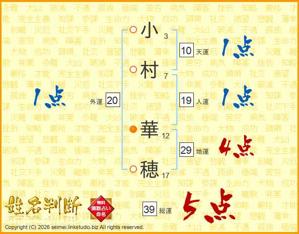生活面を象徴する運勢です。外部から受ける影響力を表し、結婚運、家庭運や職場、環境への順応性を表します。総運から人運を引いた画数。姓や名が1文字の場合を除く。
