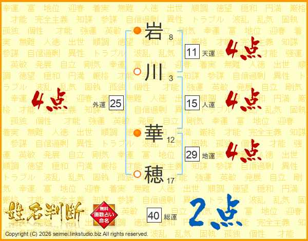 生活面を象徴する運勢です。外部から受ける影響力を表し、結婚運、家庭運や職場、環境への順応性を表します。総運から人運を引いた画数。姓や名が1文字の場合を除く。