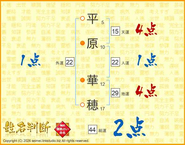 生活面を象徴する運勢です。外部から受ける影響力を表し、結婚運、家庭運や職場、環境への順応性を表します。総運から人運を引いた画数。姓や名が1文字の場合を除く。