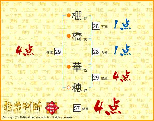 棚(12画)橋(16画) 華(12画)穂(17画)