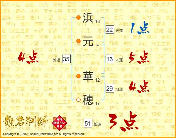 あなたの人生を表す1番重要な運勢です。生涯を通じて影響する総合運となり、主に50歳以降の晩年期に影響を及ぼします。苗字と名前の合計画数。
