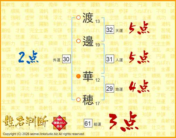 渡(13画)邊(19画) 華(12画)穂(17画)