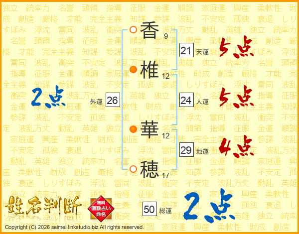 生活面を象徴する運勢です。外部から受ける影響力を表し、結婚運、家庭運や職場、環境への順応性を表します。総運から人運を引いた画数。姓や名が1文字の場合を除く。