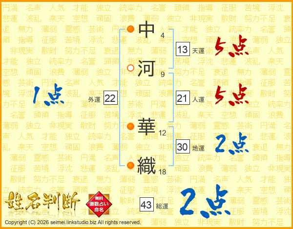 生活面を象徴する運勢です。外部から受ける影響力を表し、結婚運、家庭運や職場、環境への順応性を表します。総運から人運を引いた画数。姓や名が1文字の場合を除く。