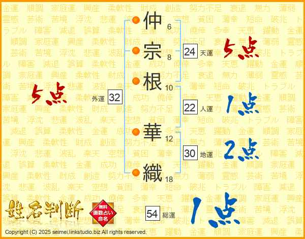 仲(6画)宗(8画)根(10画) 華(12画)織(18画)