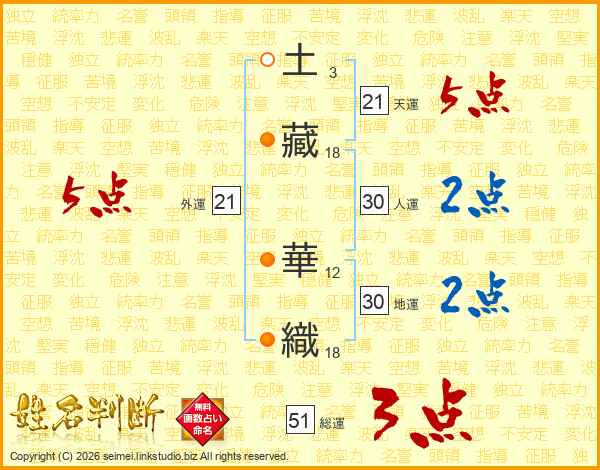 生活面を象徴する運勢です。外部から受ける影響力を表し、結婚運、家庭運や職場、環境への順応性を表します。総運から人運を引いた画数。姓や名が1文字の場合を除く。