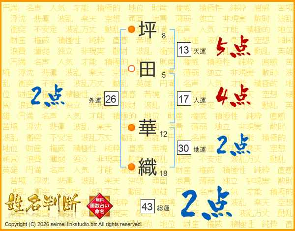 生活面を象徴する運勢です。外部から受ける影響力を表し、結婚運、家庭運や職場、環境への順応性を表します。総運から人運を引いた画数。姓や名が1文字の場合を除く。