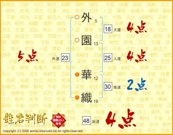 生活面を象徴する運勢です。外部から受ける影響力を表し、結婚運、家庭運や職場、環境への順応性を表します。総運から人運を引いた画数。姓や名が1文字の場合を除く。