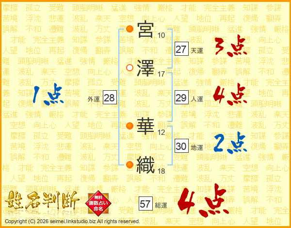 生活面を象徴する運勢です。外部から受ける影響力を表し、結婚運、家庭運や職場、環境への順応性を表します。総運から人運を引いた画数。姓や名が1文字の場合を除く。