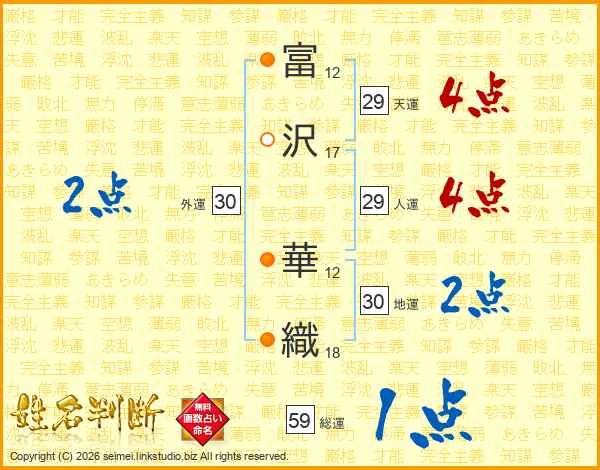 富(12画)沢(17画) 華(12画)織(18画)