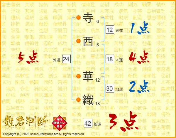 寺(6画)西(6画) 華(12画)織(18画)