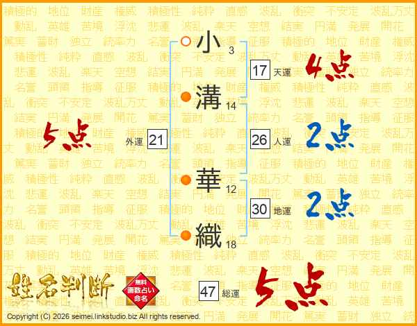 生活面を象徴する運勢です。外部から受ける影響力を表し、結婚運、家庭運や職場、環境への順応性を表します。総運から人運を引いた画数。姓や名が1文字の場合を除く。