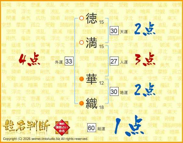 徳(15画)満(15画) 華(12画)織(18画)