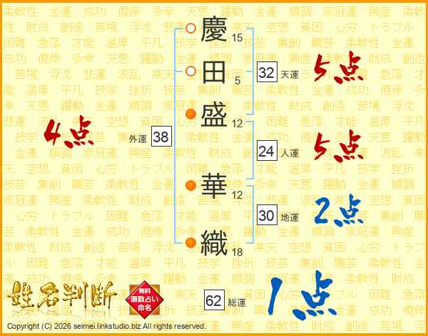 慶(15画)田(5画)盛(12画) 華(12画)織(18画)