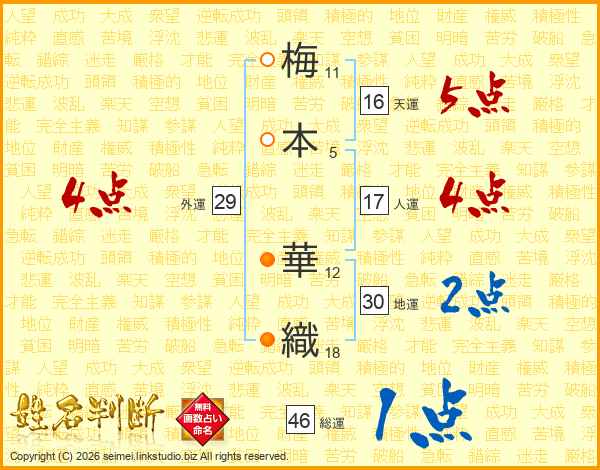 あなたの人生を表す1番重要な運勢です。生涯を通じて影響する総合運となり、主に50歳以降の晩年期に影響を及ぼします。苗字と名前の合計画数。