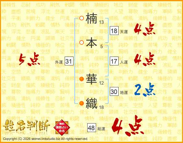 あなたの人生を表す1番重要な運勢です。生涯を通じて影響する総合運となり、主に50歳以降の晩年期に影響を及ぼします。苗字と名前の合計画数。