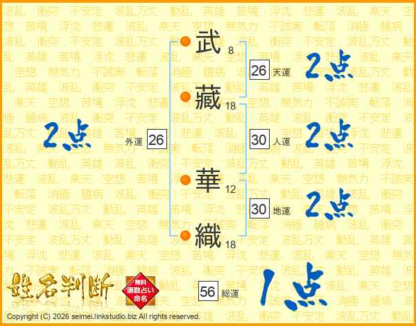 生活面を象徴する運勢です。外部から受ける影響力を表し、結婚運、家庭運や職場、環境への順応性を表します。総運から人運を引いた画数。姓や名が1文字の場合を除く。