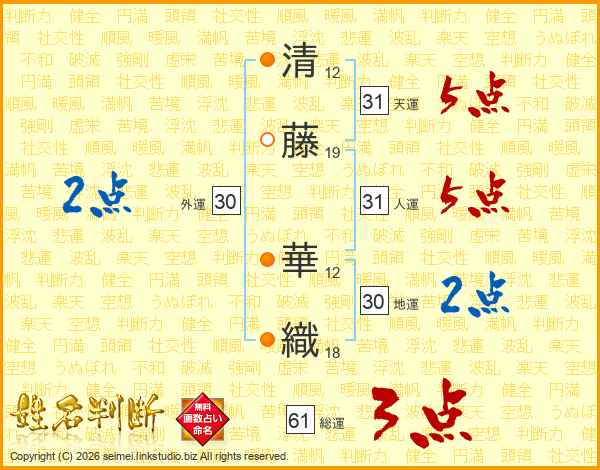 清(12画)藤(19画) 華(12画)織(18画)