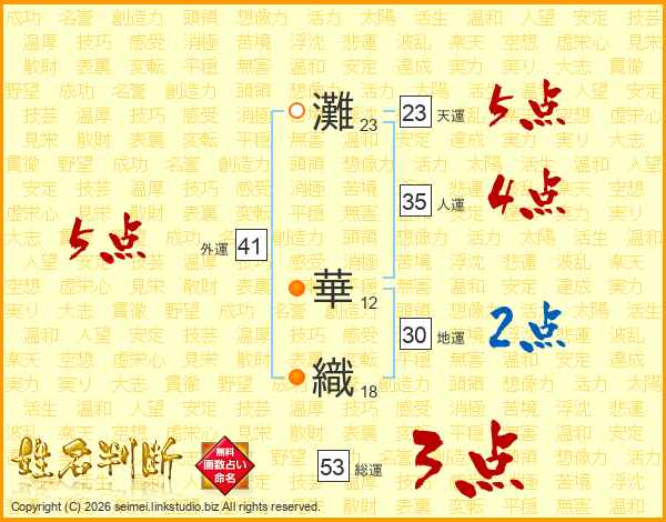 家系が持つ宿命的な運勢を表します。祖先から受け継いだ苗字ですので自分の力が及びません。家柄を象徴します。苗字の合計画数。