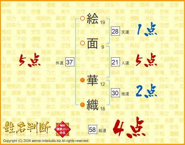 絵(19画)面(9画) 華(12画)織(18画)