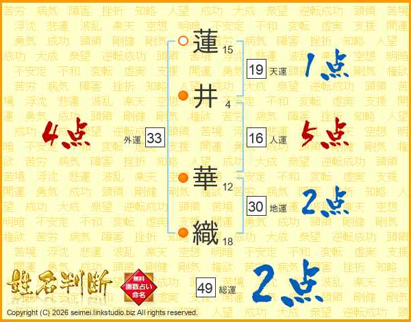 蓮(15画)井(4画) 華(12画)織(18画)