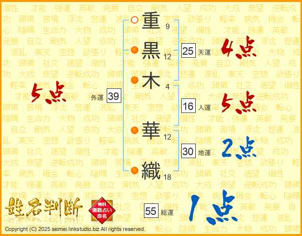 重(9画)黒(12画)木(4画) 華(12画)織(18画)