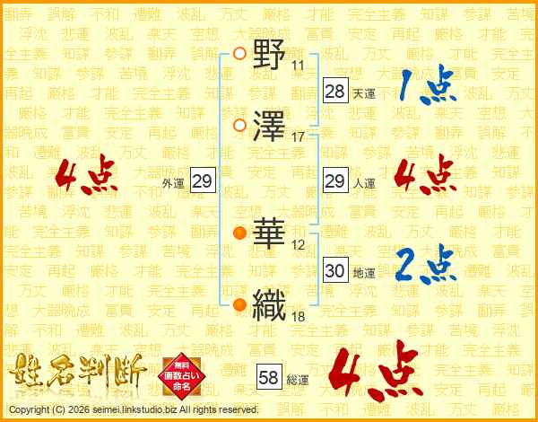 野(11画)澤(17画) 華(12画)織(18画)