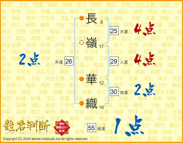 長(8画)嶺(17画) 華(12画)織(18画)