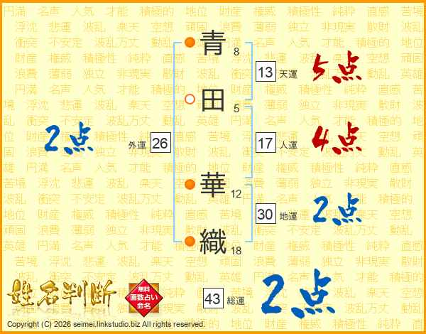 青田華織さんの天運は13画の5点!