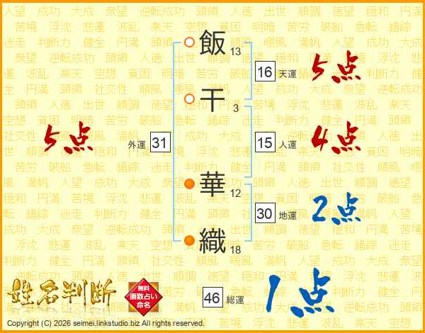 生活面を象徴する運勢です。外部から受ける影響力を表し、結婚運、家庭運や職場、環境への順応性を表します。総運から人運を引いた画数。姓や名が1文字の場合を除く。