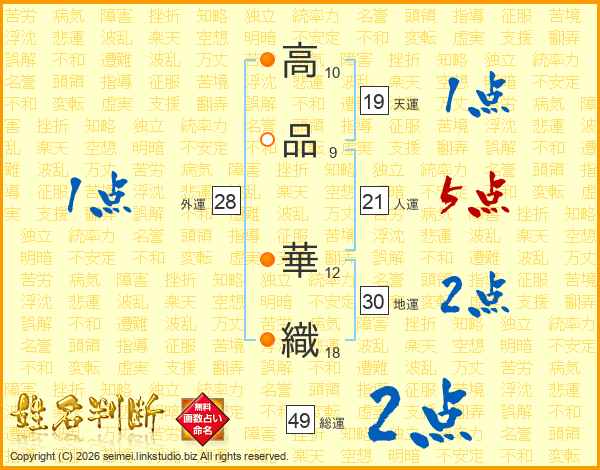 高(10画)品(9画) 華(12画)織(18画)
