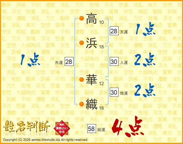 あなたの人生を表す1番重要な運勢です。生涯を通じて影響する総合運となり、主に50歳以降の晩年期に影響を及ぼします。苗字と名前の合計画数。