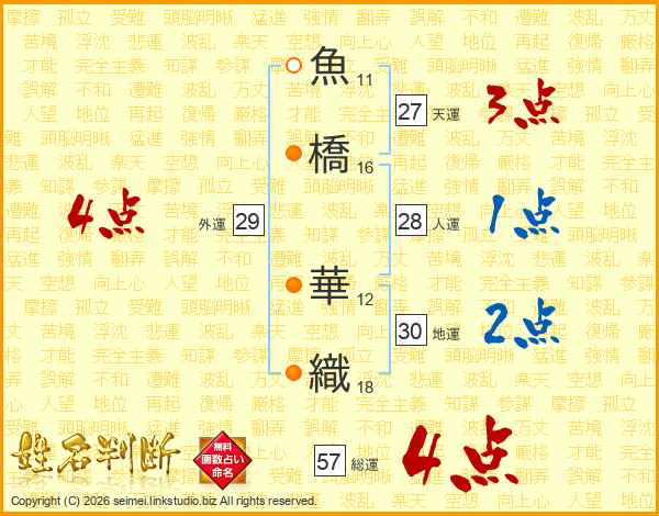 画数の奇数(○陽)と偶数(●陰)の配列で吉凶を占います。どちらかにかたよる名前は大凶名で避ける必要があります。画数の奇数偶数。
