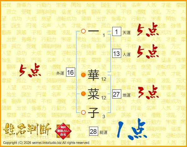 一(1画) 華(12画)菜(12画)子(3画)