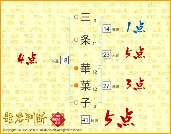 三条華菜子さんの総運は41画の5点!