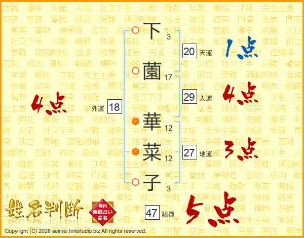 下(3画)薗(17画) 華(12画)菜(12画)子(3画)