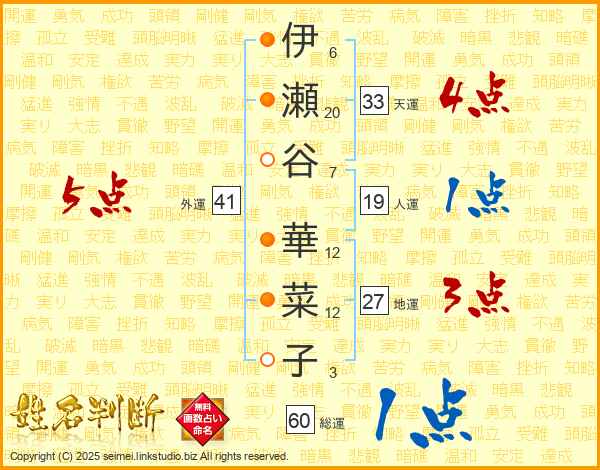 伊(6画)瀬(20画)谷(7画) 華(12画)菜(12画)子(3画)