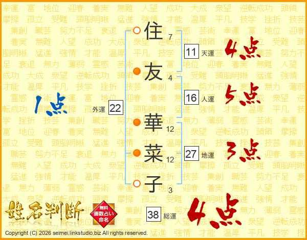 住(7画)友(4画) 華(12画)菜(12画)子(3画)