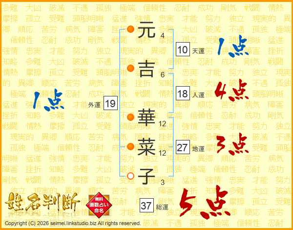 元(4画)吉(6画) 華(12画)菜(12画)子(3画)